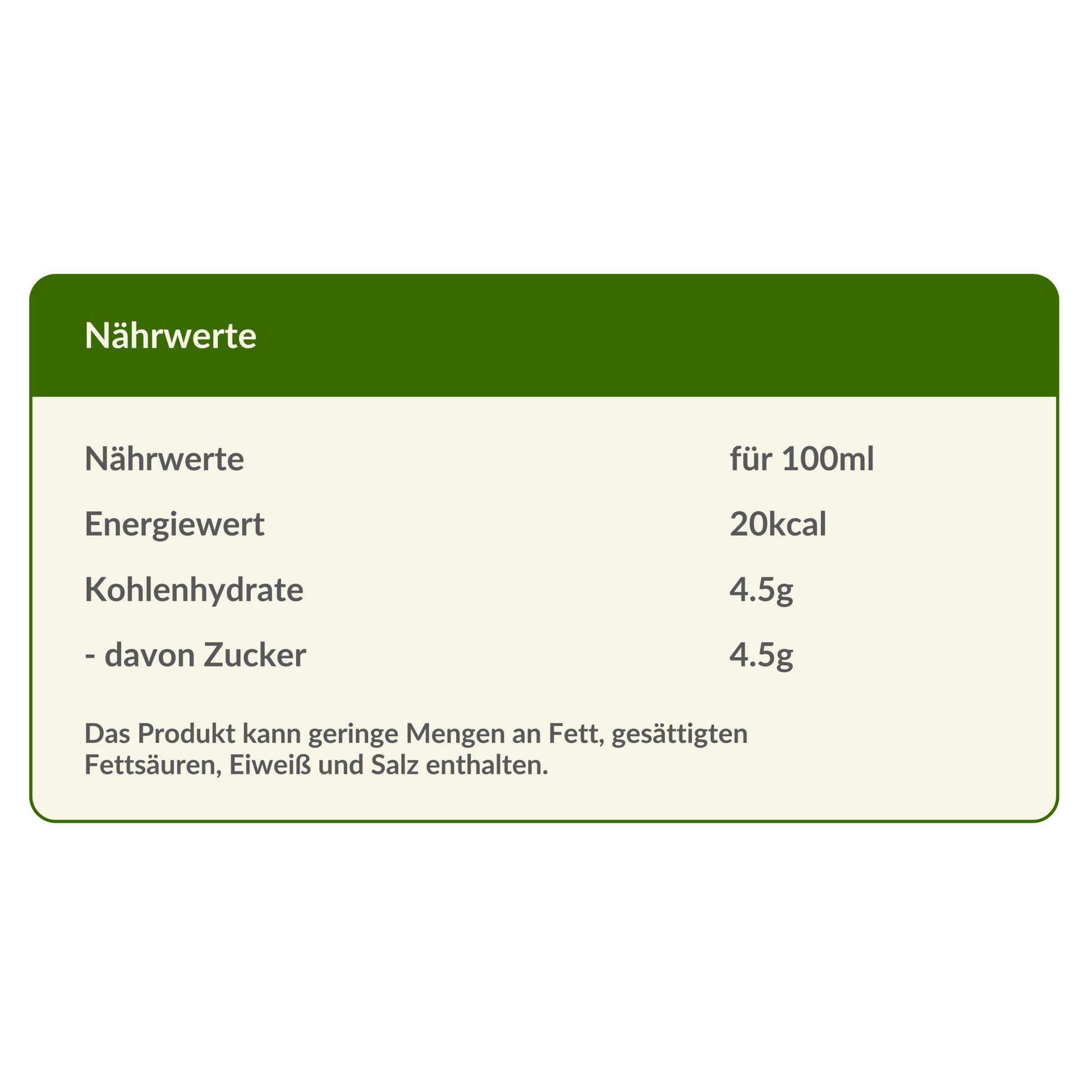 - Kalorienarm (~20 kcal/100 ml) bei moderatem Zuckergehalt (~4,8 g/100 ml).