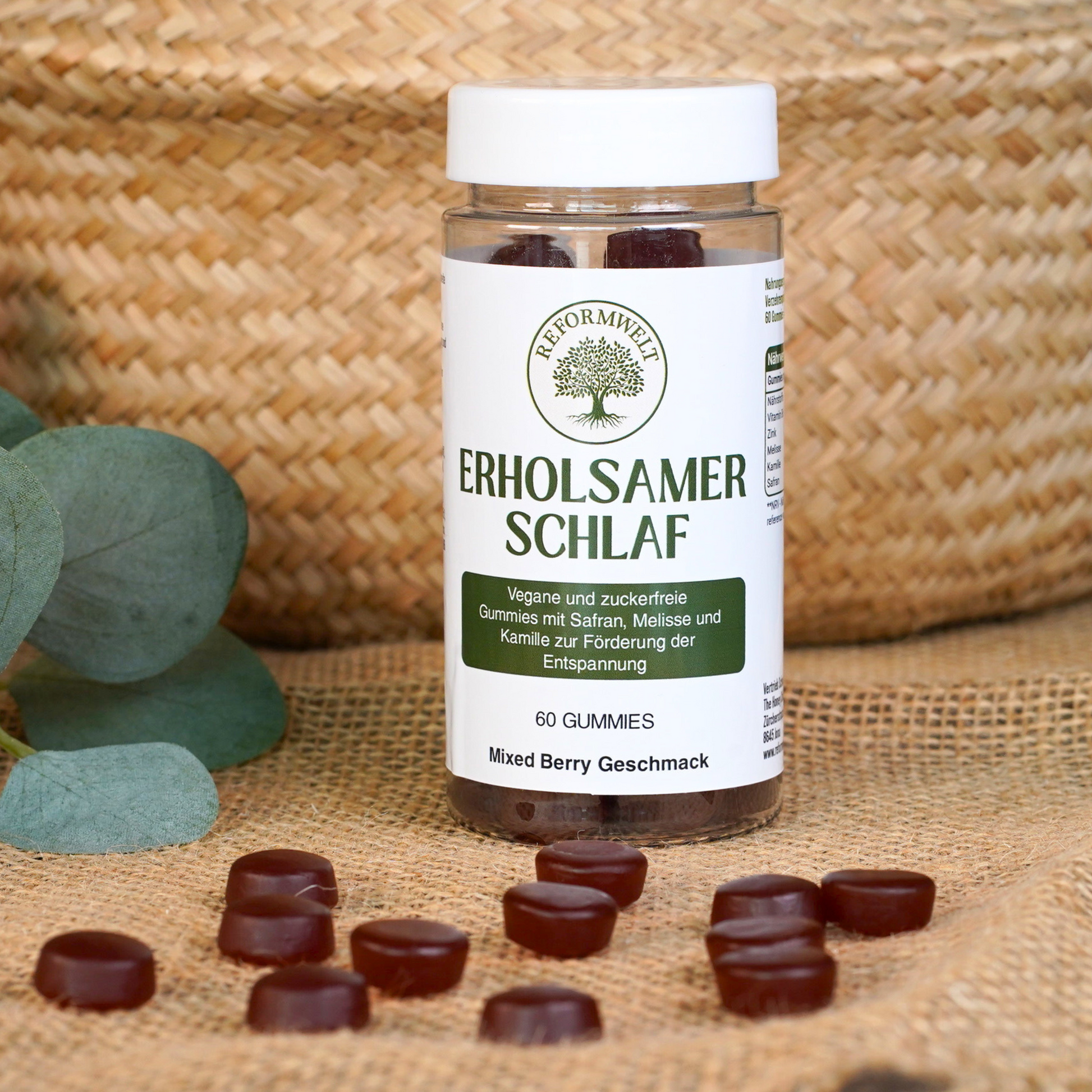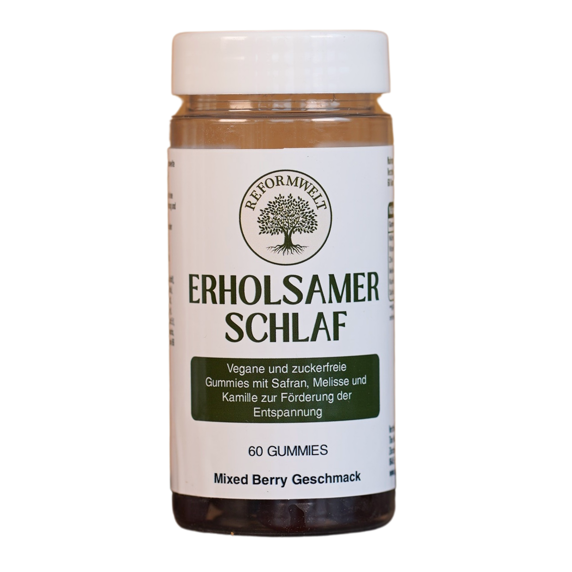 Erholsamer Schlaf sind Reformwelt-Vegan-Gummies, die speziell entwickelt wurden, um eine entspannte Einschlafphase und einen tieferen, regenerativen Schlaf zu fördern – mit einer Kombination aus beruhigenden Pflanzenextrakten, Vitaminen und Mineralstoffen.