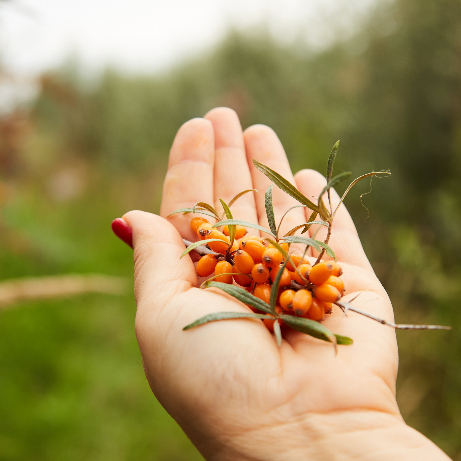 Mit einem außergewöhnlichen Nährstoffprofil, das Vitamine (A, B, C, E), essenzielle Fettsäuren (Omega 3, 6, 7 und 9), Mineralstoffe (Magnesium, Phosphor, Kalium und Zink), Aminosäuren und Antioxidantien umfasst, wird Sanddorn heute weltweit als Super-food gefeiert, das den Körper von innen heraus nährt.