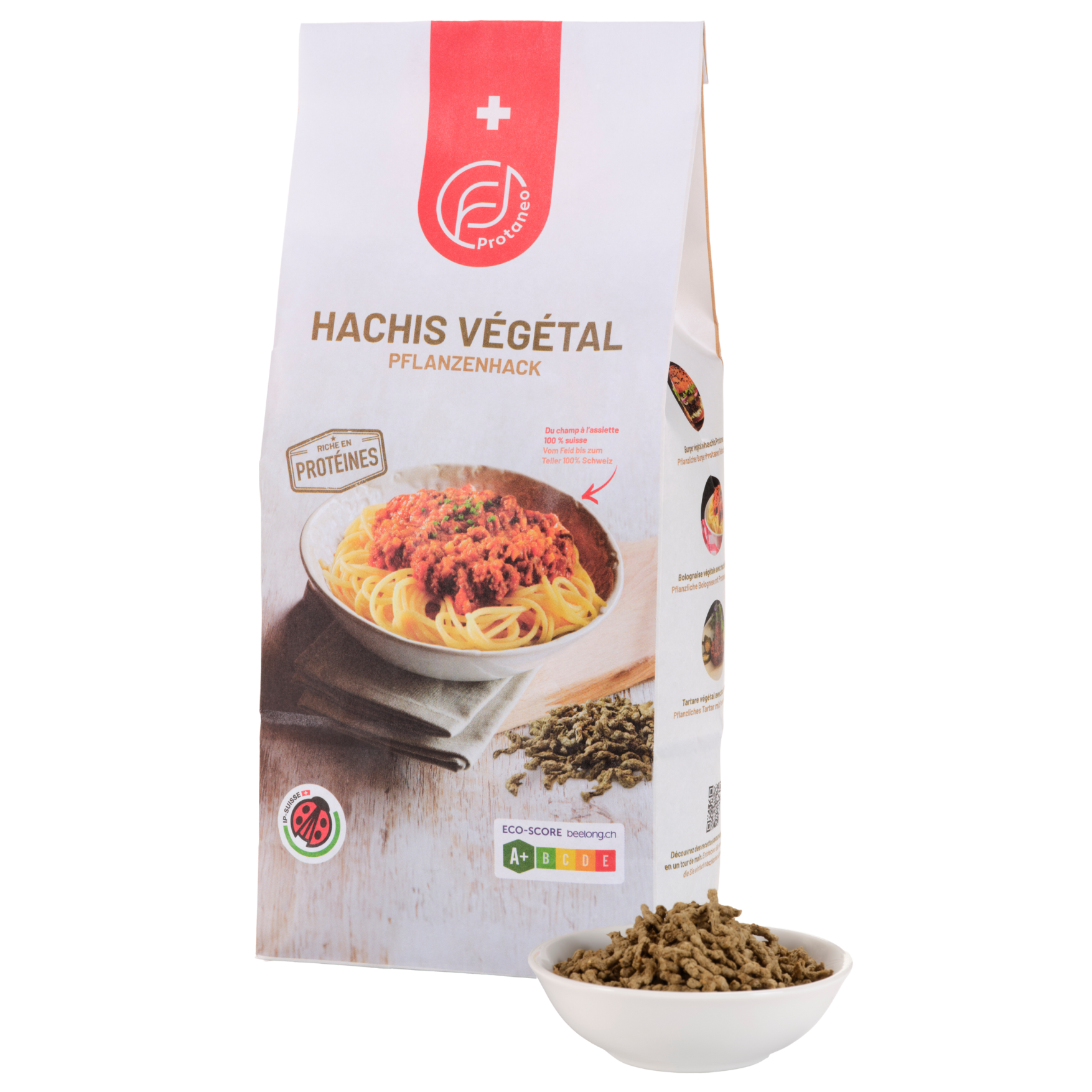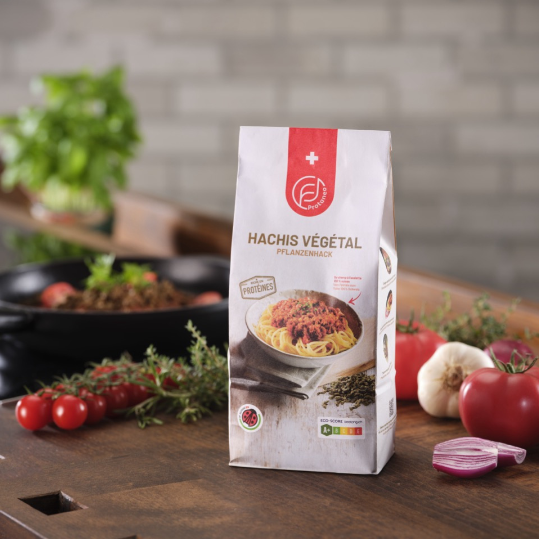 Das pflanzenbasierte Hack von Protaneo ist eine vielseitige und geschmacksintensive Alternative zu traditionellem Hackfleisch. Hergestellt aus einer nährstoffreichen Mischung aus schweizerischem Ackerbohnenprotein, Erbsenprotein, entöltem Sonnenblumenpresskuchen und entöltem Kürbiskernpresskuchen bietet es eine herzhafte Textur und einen neutralen Geschmack, der Gewürze und Saucen hervorragend aufnimmt.