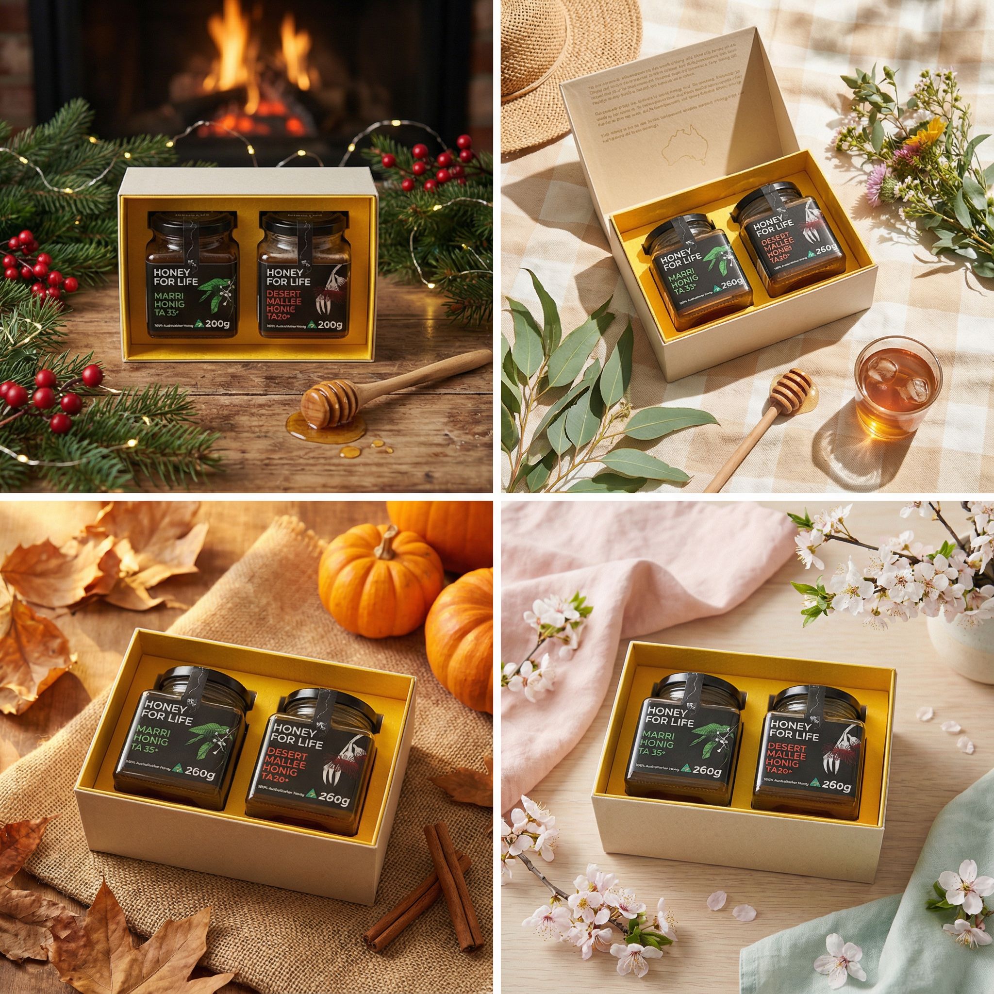 In dieser Box gibt’s zwei ganz besondere Honige aus Westaustralien: den kräftigen Honey For Life Marri TA 35+ und den karamelligen Desert Mallee TA 20+. Beide sind roh, naturbelassen und voller natürlicher Power – perfekt, wenn du dein Immunsystem auf natürliche Weise unterstützen willst. Ob im Tee, aufs Brot oder einfach pur – sie schmecken fantastisch und wirken ganz natürlich antibakteriell. Ideal als Geschenk oder zum Verwöhnen.